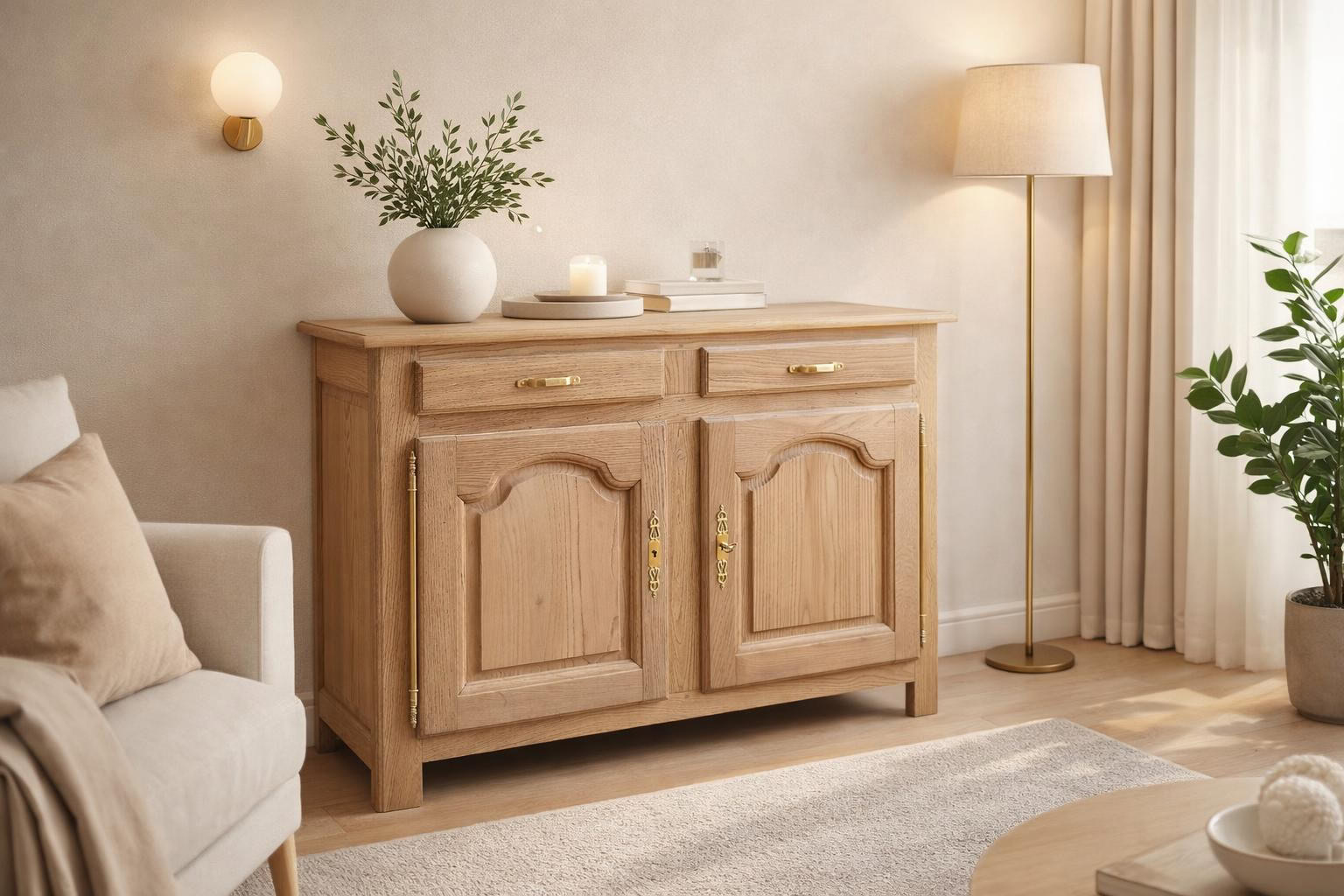 Buffet ancien restauré pour un look champêtre dans des tons de chêne clair.